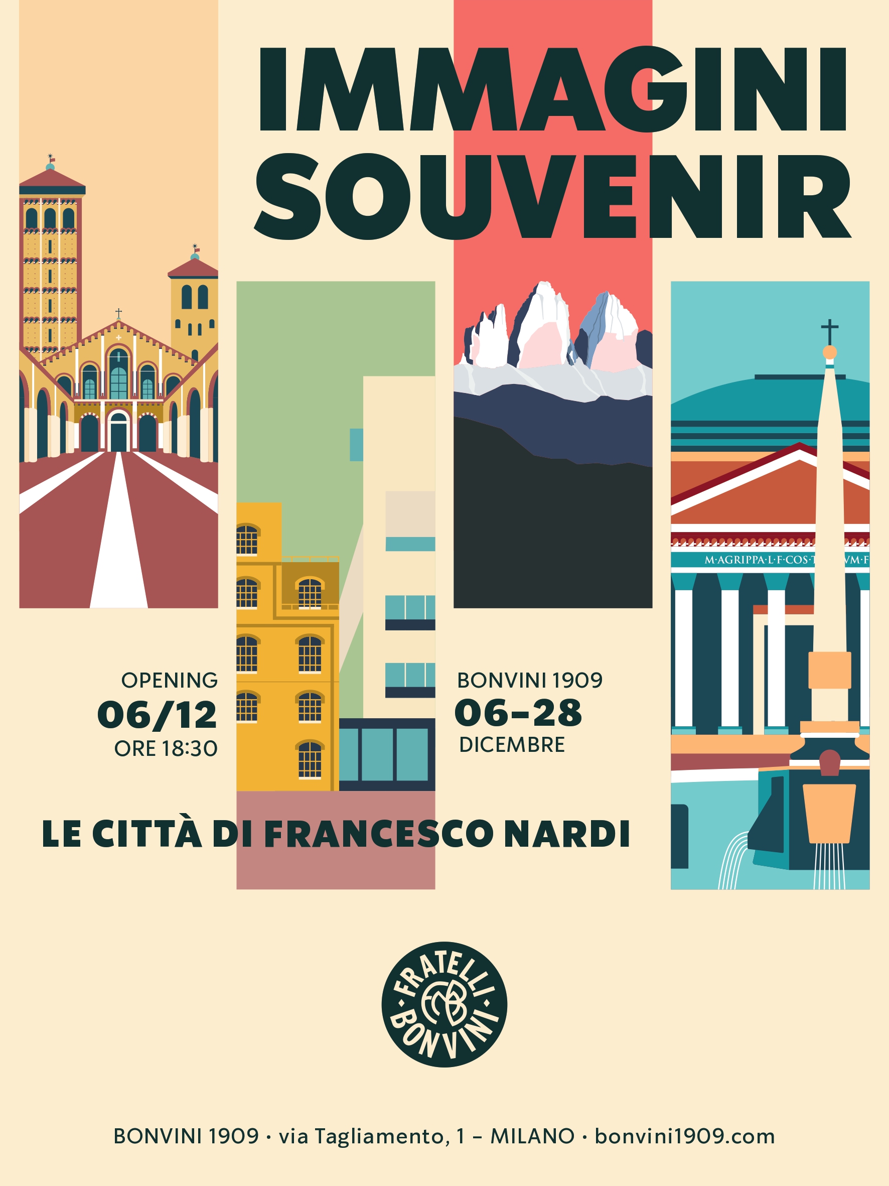Immagini souvenir è una mostra di illustrazioni di Francesco Nardi. Nelle illustrazioni di Francesco Nardi, i luoghi rappresentati – architetture, piazze, paesaggi, strade, elementi scultorei o urbanistici, prospettive – sono capaci di raccontare storie a chi li osserva, a chi li vive nel quotidiano o da visitatore. Sono patrimonio, sono i protagonisti di un immaginario storico e collettivo che si intreccia all’esperienza emotiva e alla memoria individuale.