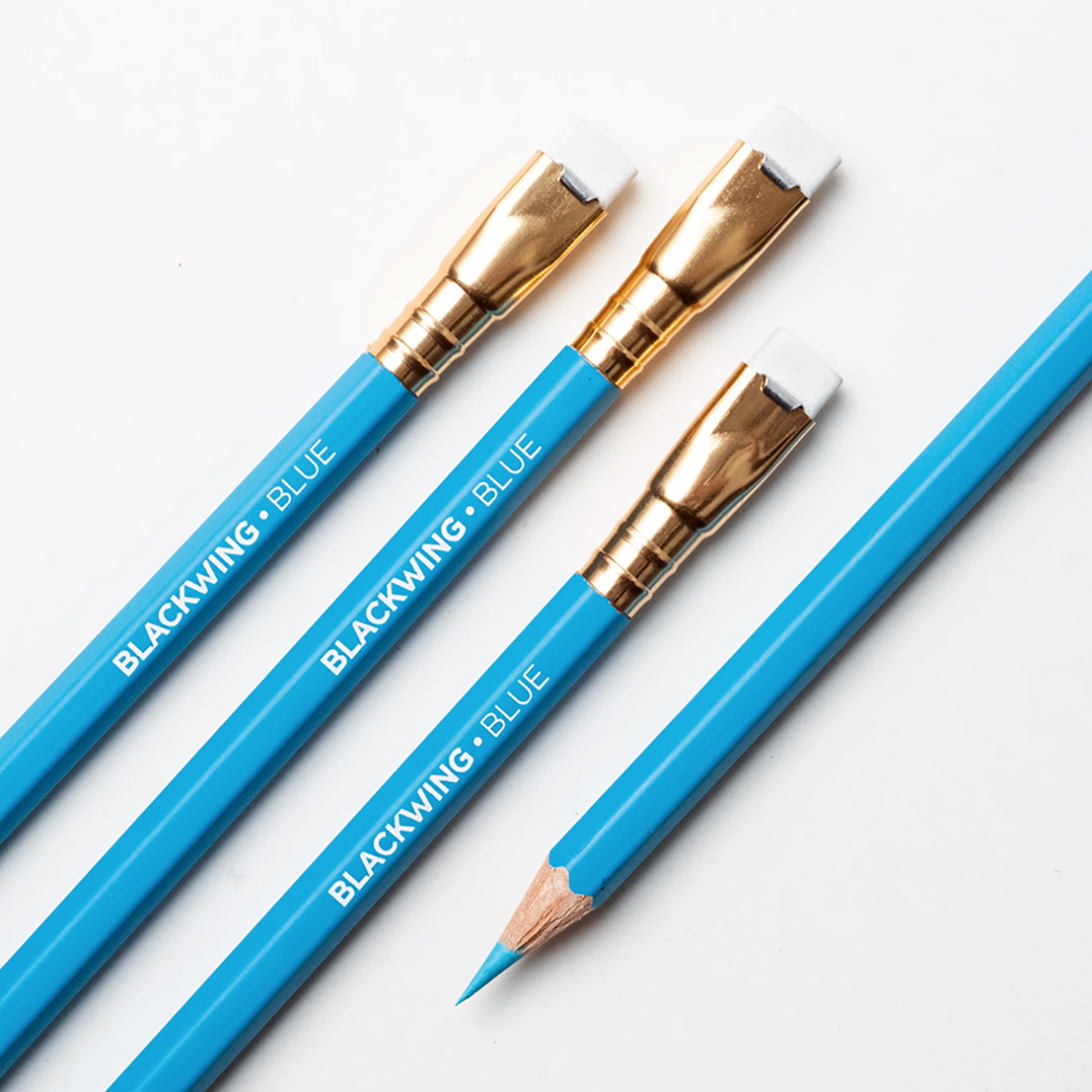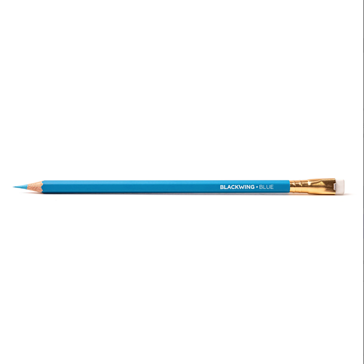 La matita Blackwing blue presenta un tratto caratterizzato da un tono blu acceso, fusto color blu con finitura opaca e iconica ghiera Blackwing e gommino bianco.