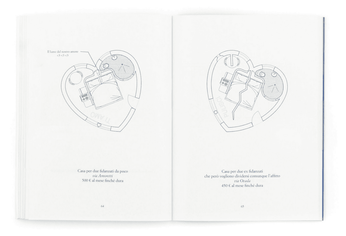 Intelligente, leggero e ironico Case Milanesissime è un compendio di piante surreali (o iperreali?) di appartamenti immaginari offerti in affitto o in vendita a Milano, come “Camera ricavata in intercapedine di facciata”, “Appartamento della Milano che non si ferma” con tapis-roulant continuo o “Casa per due ex fidanzati che però vogliono dividersi comunque l’affitto”. Una satira serissima sul mondo della progettazione contemporanea e un elemento di riflessione sulla dimensione abitativa della metropoli.